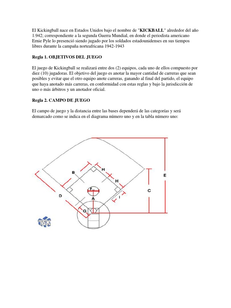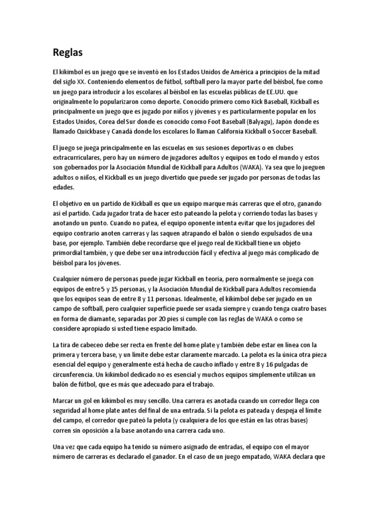 El juego de kickingball se realizará entre dos 2 equipos cada uno de elloscompuesto por diez 10 jugadoras. El objetivo del juego es anotar la mayor cantidad de carreras que sean posibles y evitar que el otro equipo anote carreras ganando al final del partido el equipo que haya anotado más carreras en conformidad con estas reglas y. Generalmente un partido completo de 9 entradas tiene una duración de por sí solo de 1 45 una hora y cuarenta y cinco minutos.